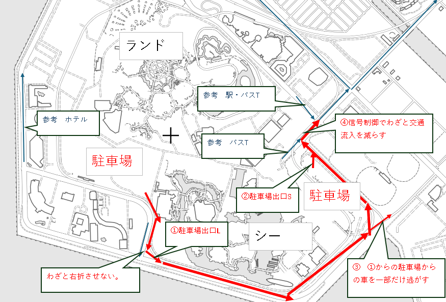 - ①ランド側出口:一気に車が出てくるポイント。ここでは出た直後にわざと左折させて回り道をさせ、メイン道路への集中を防いでいます