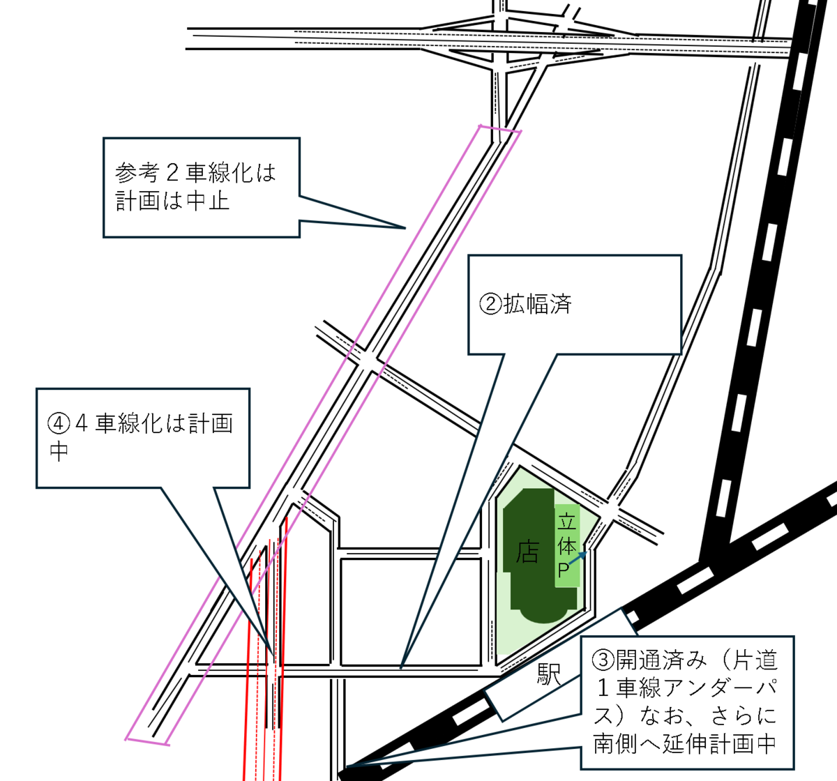 4. 踏切道路の高架化計画 既存の踏切がある道路について、現状の片道1車線から片道2車線にして高架化する計画があります。これが実現すれば、踏切による交通遮断問題の根本的解決が期待されます。