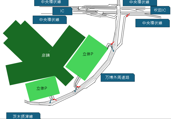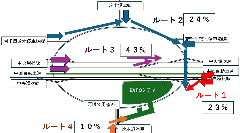 - 中央環状線の西側(千里中央側)からの直接ルートを追加(前回記事のルート3に該当)この道を施設全体の43%の車が使う