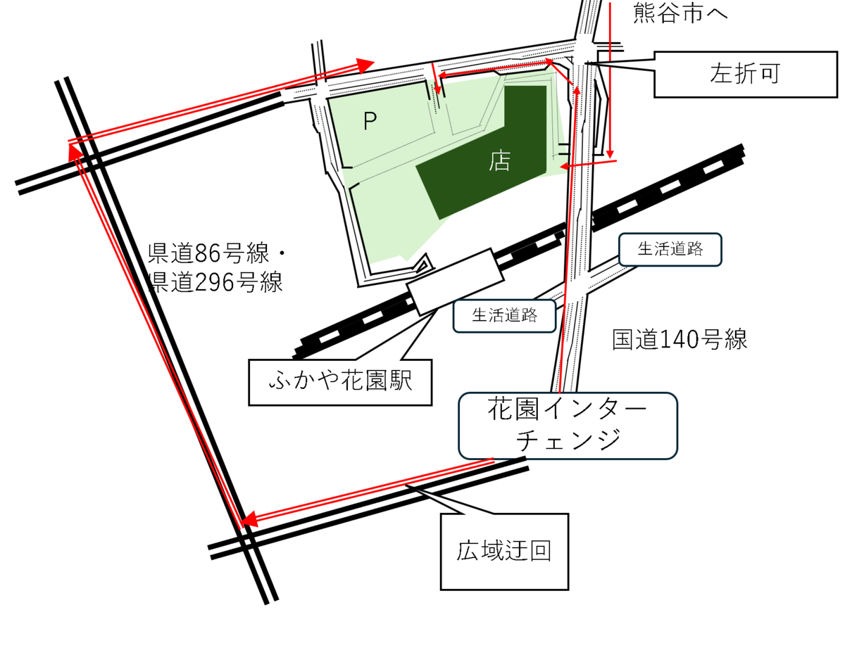 熊谷方面からのアクセス 国道140号線を熊谷方面から来る場合は、この交差点を通り過ぎて側道へ入ると、アンダーパスを通って信号を右折することなく店舗にアクセスできる設計になっています。