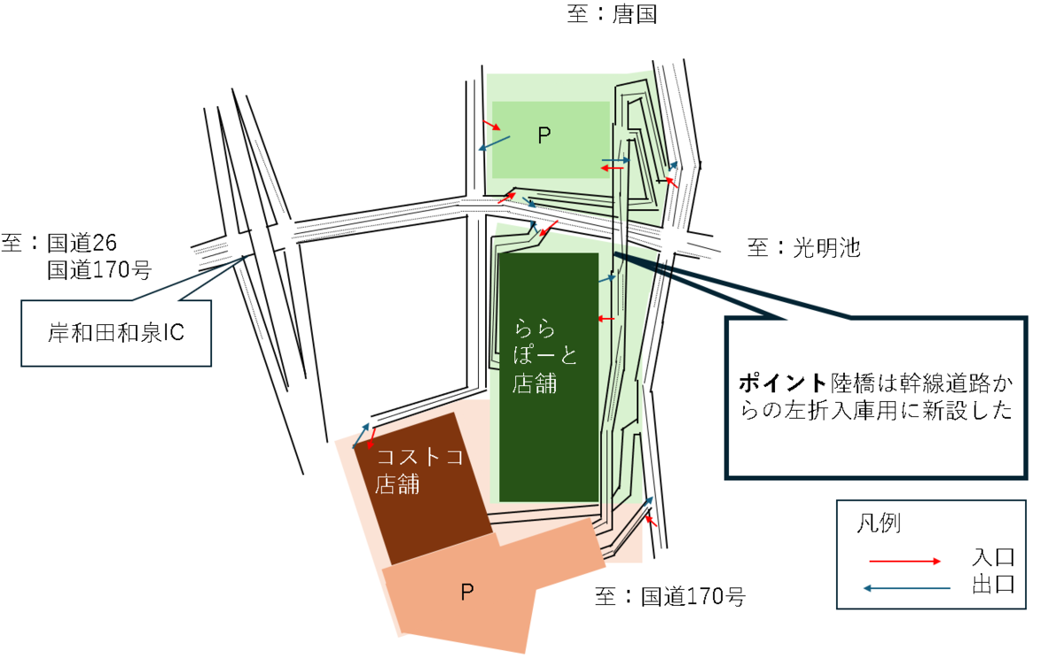店舗の北側にある駐車場と、メインの店舗建物の間に連絡橋がなかったんです。そのため、岸和田和泉ICから来た車が右折で駐車場に入ろうとすると、大渋滞が発生してしまいました。