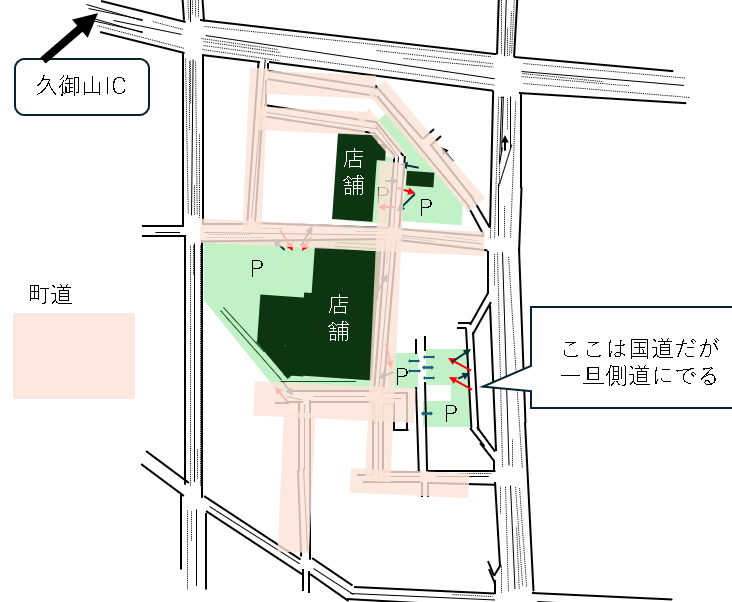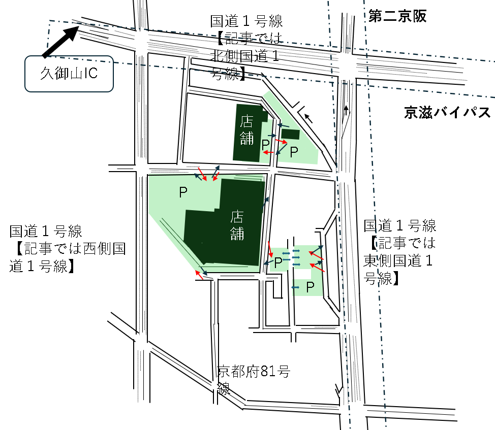 イオンモール久御山は、国道から直接出入りできない。必ず一度、久御山町が管理する町道を経由する構造になっている。(南東駐車場を除く)