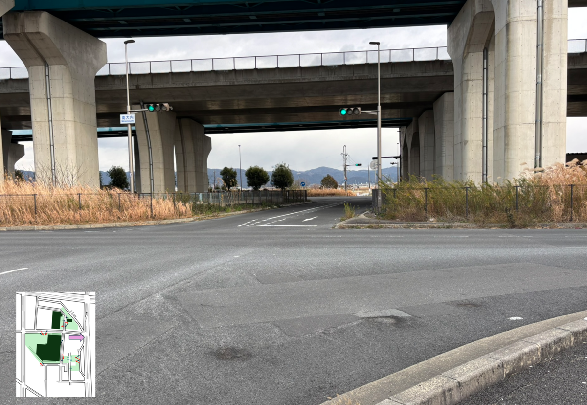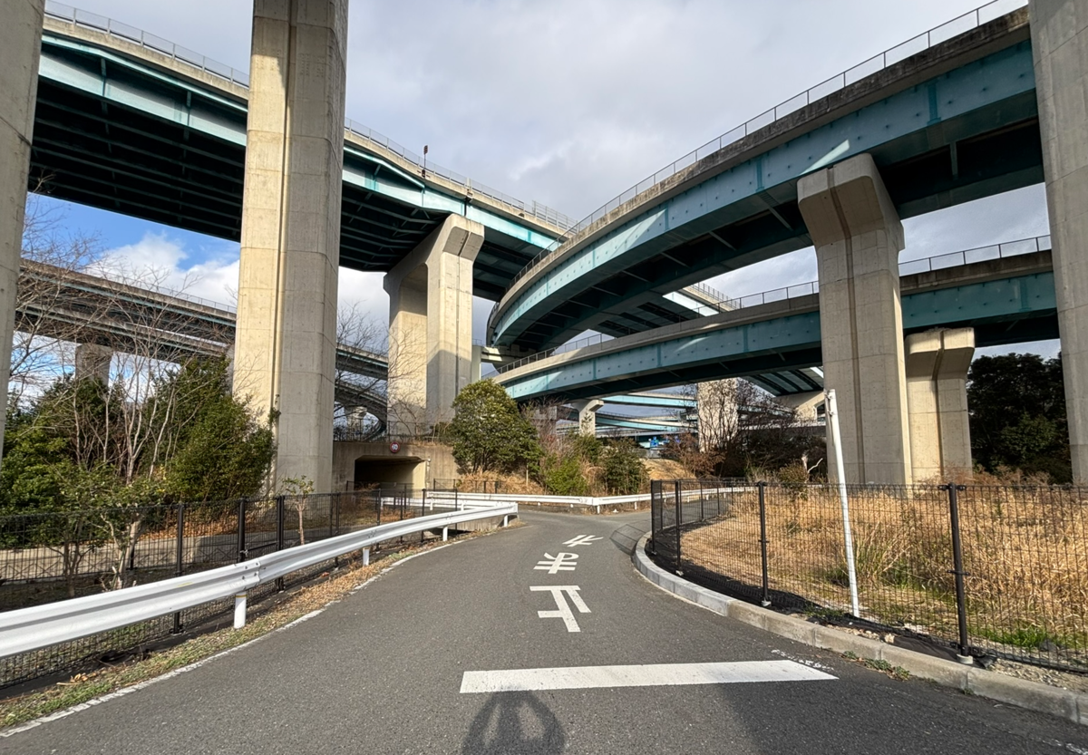 南東側から国道1号線へは一方通行路を経由。直接合流させず、加速・判断の余地を与えている。