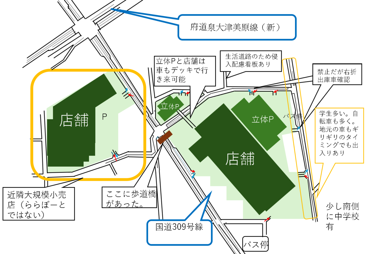 ららぽーと堺は堺市美原区の交通要衝に位置しています。国道309号線(片道2車線)沿いという好立地の一方で、すぐ北側には府道泉大津美原線(片道2車線の基本高架道路)が走る、非常に交通が密集する地域です。