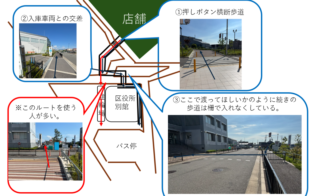 しかし現実では、多くの人が押しボタンを押さずに赤信号で横断し、区役所の駐輪場を抜け道として利用しています。心理的に最短距離を選ぶのは当然の行動でしょう。