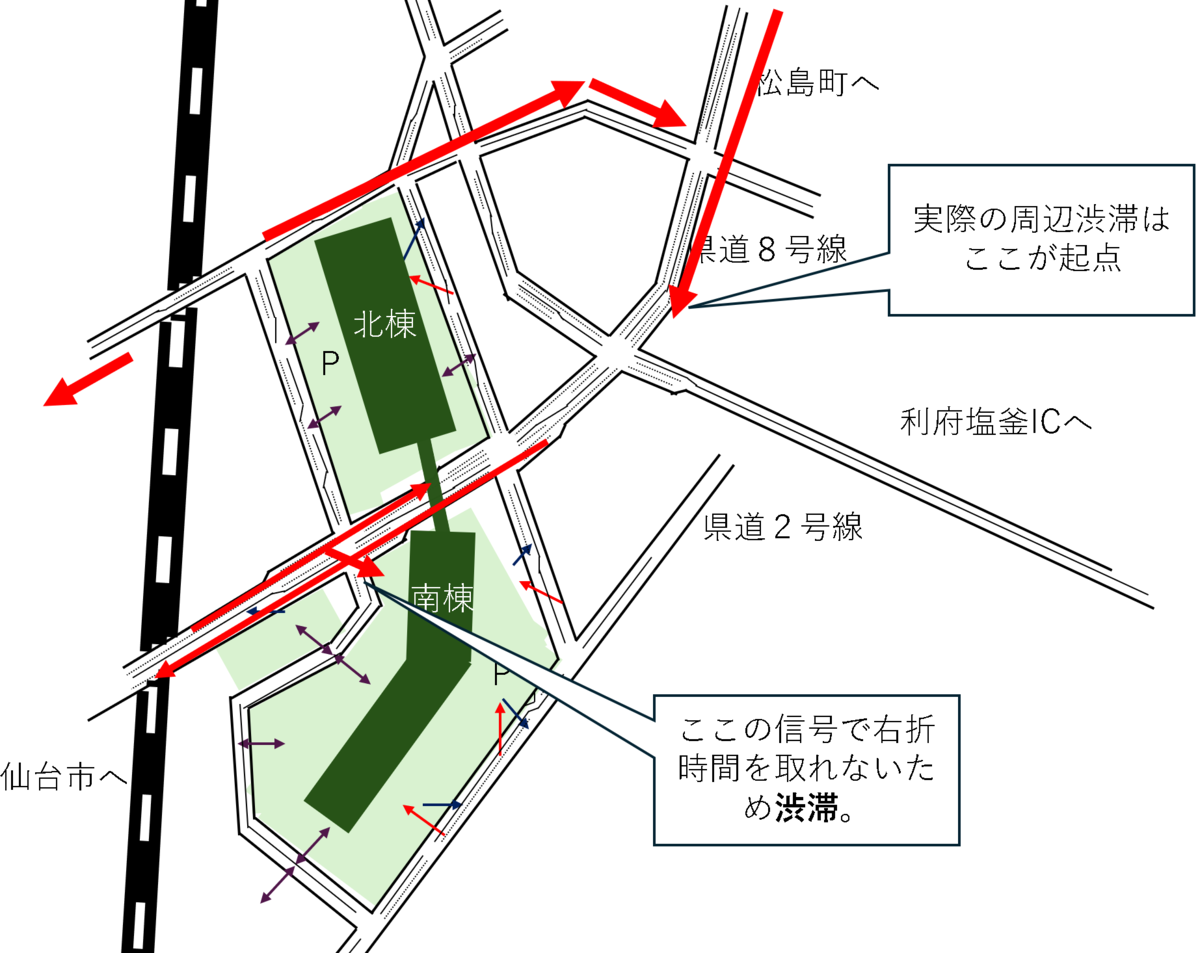 そもそも、県道8号線の通行量が多い、これは覆せない。そこにイオンモールは仙台市方面から県道8号線を進んだときの信号制御で右折時間を取れないのが、右折による渋滞として目に見えて分かりやすいということであろう。