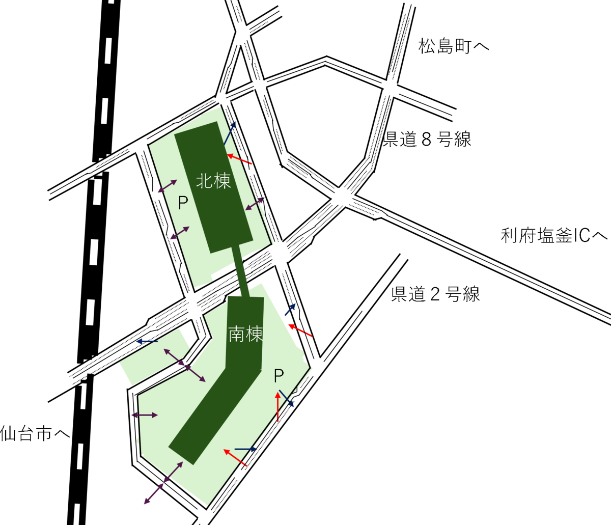 利府地区周辺の(主)仙台松島線では、交通混雑が著しいことに加え、令和3年3月には、東北最大規模の大規模商業施設が開業。利府地区には、宮城県総合運動公園が立地し、イベント時などには交通混雑が顕在。