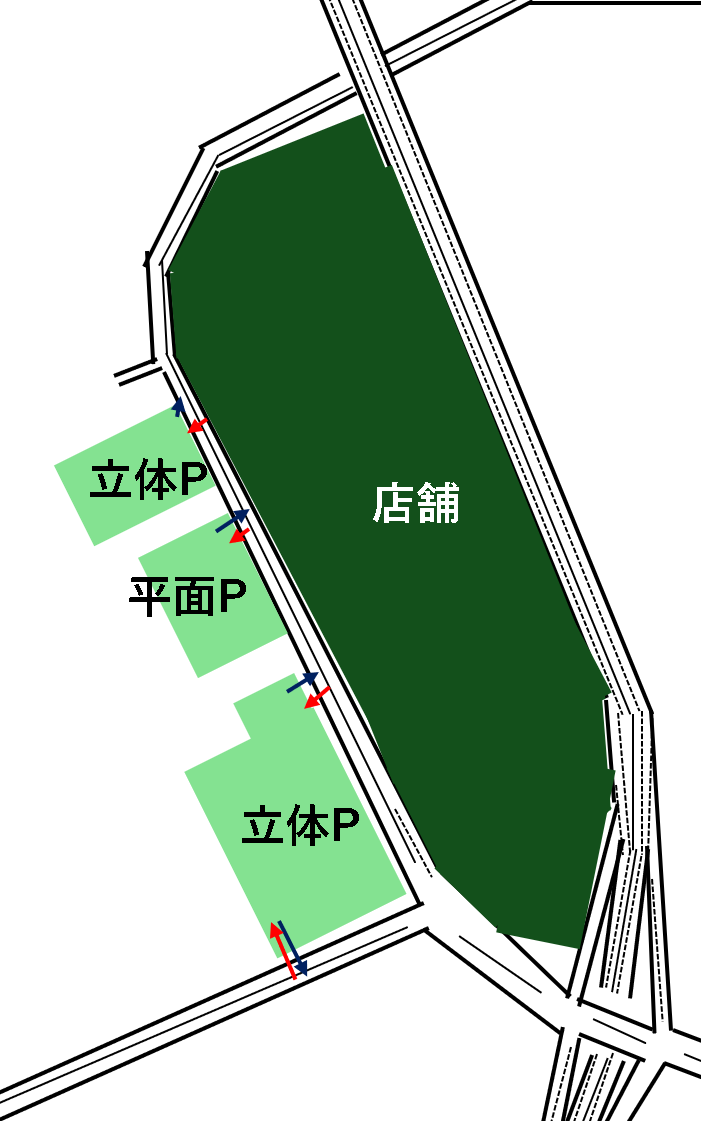 駐車台数は2,900台です。 仮に大体3時間で入れ替えとなると、1時間あたり1,000台の入出庫があります。 で、一般道路の片道1車線では一時間あたり700台さばける説が有力です。 これが、店の前で北側と南側と西側に進める3方向があります。