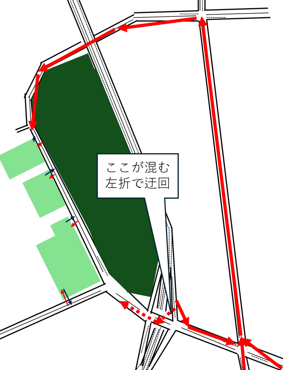 施設側はこの交差点の問題を知っているのか迂回ルートを呼び掛けてます
