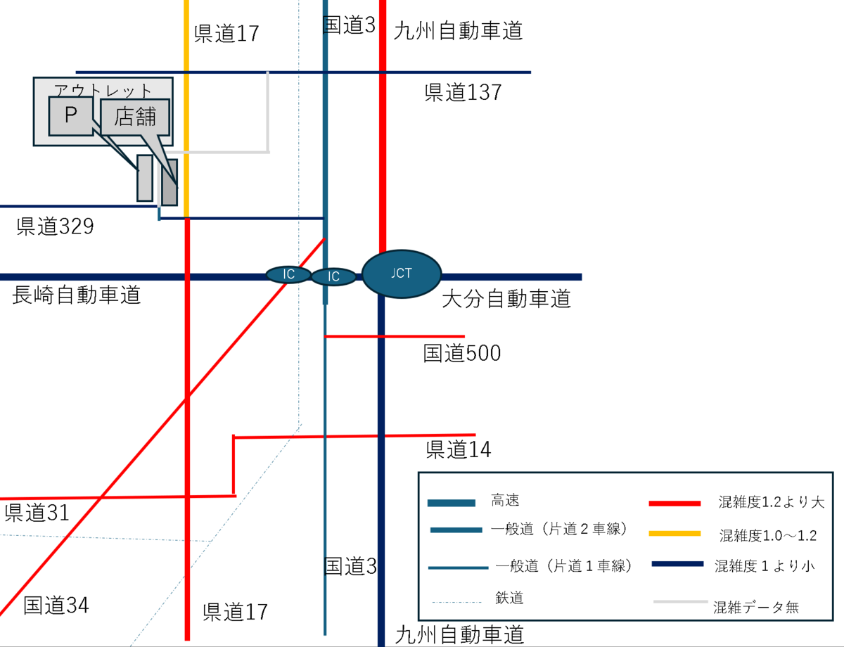 平日の交通混雑率データを見ると、 アウトレット周辺の主要道路はすでに赤(混雑)・黄色(流れが悪い)が目立ちます。